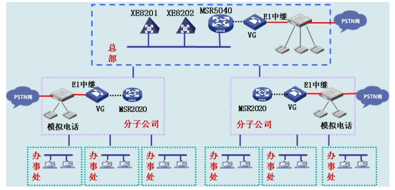集團總部和分子公司部署H3C公司的VG80-20作為語音網(wǎng)關(guān),VG 80-20提供2個E1語音接口用于接連接程控電話交換機PBX的E1中繼線,通過以太網(wǎng)口連接到IP網(wǎng)中。