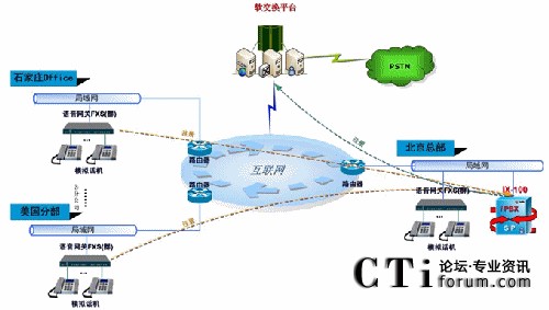 在石家莊,也安裝1臺48FXS語音網(wǎng)關(guān),該網(wǎng)關(guān)可接48部模擬話機,通過公網(wǎng)直接注冊至總部的IX-100,作為公司的遠(yuǎn)程分機,享受功能和總部的分機完全相同,做到移地仿真的虛擬統(tǒng)一。