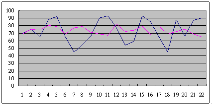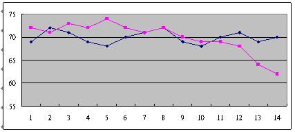 這是兩個(gè)呼叫中心從早上8點(diǎn)開始,一直到晚上6點(diǎn),每隔半個(gè)小時(shí)的服務(wù)水平?梢院芮宄目吹剑{(lán)色這條線,它服務(wù)水平在91到48這中間震蕩,平均服務(wù)水平是73左右,粉紅色這條線,雖然平均服務(wù)水平也是在73左右,但震蕩幅度卻小了很多,服務(wù)水平只在81到68這中間震蕩。