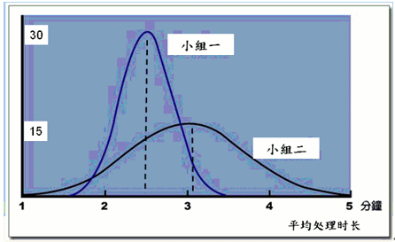 這是兩個(gè)班組的平均處理時(shí)長的頻次表,橫軸是平均處理時(shí)長的時(shí)間,縱軸是座席員數(shù)目,小組二的平均處理時(shí)長的平均數(shù)超過3分鐘,大約是3.1分鐘,有15人平均處理時(shí)長是在這個(gè)平均數(shù),而小組一的平均處理時(shí)長的平均數(shù)是2.5分鐘,有30人平均處理時(shí)長是在這個(gè)平均數(shù)(請(qǐng)看縱軸)。