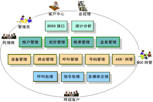 Lanyears VoIP SoftSwitch系統(tǒng)的功能體系結(jié)構(gòu):設(shè)計架構(gòu)以營運流程為核心,支持現(xiàn)有的商務(wù)流程.系統(tǒng)可以依據(jù)不同的角色的用戶,提供不同的權(quán)限和界面和功能。依照實際業(yè)務(wù)的管理可分為可以分為終端用戶,網(wǎng)管,管理員,代理商,客戶中心,總經(jīng)理等幾種不同的角色。