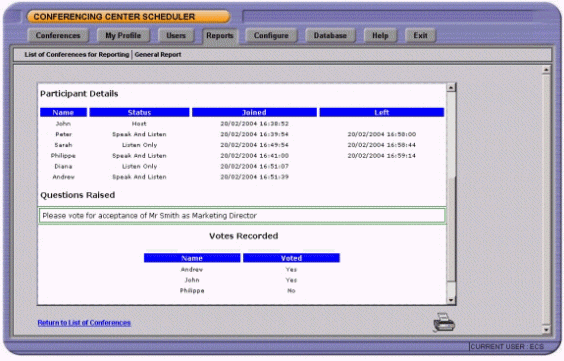管理員可以生成會(huì)議使用率和每個(gè)會(huì)議的報(bào)告。消息內(nèi)容包括會(huì)議名稱,ID號(hào),會(huì)議起始日期,會(huì)議持續(xù)時(shí)間和與會(huì)人員的數(shù)目。每個(gè)會(huì)議報(bào)告可以列出與會(huì)人員的詳細(xì)列表和他們何時(shí)進(jìn)入/離開會(huì)議。