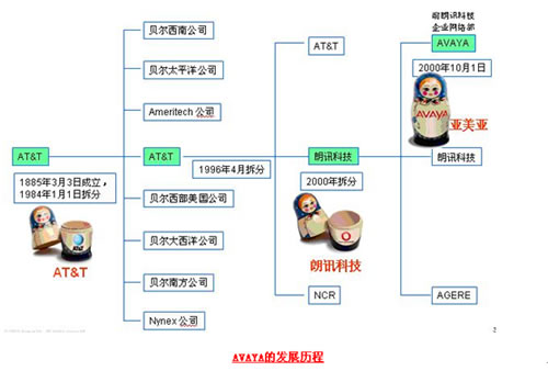 Avaya的歷史最早可以追溯到1885年成立的美國電話電報(bào)公司(AT&T),AT&T在1994年一分為AT&T、朗訊科技、NCR等三家公司,而Avaya于2000年10月從朗訊科技的企業(yè)通信部門剝離獨(dú)立上市(代碼AV),再后來即上文中提到的Avaya被兩大私募德州太平洋集團(tuán)和銀湖合伙組成的財(cái)團(tuán)用82億美元私有化。