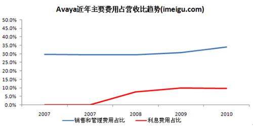 2010財(cái)年Avaya取得50.26億美元的營收,其中產(chǎn)品收入、服務(wù)收入分別占總營收的54%、46%,大約55%來自美國市場,全年凈虧損8.71億美元,調(diào)整后的EBITDA為7.95億美元(單利息費(fèi)用一項(xiàng)就達(dá)4.87億美元)。