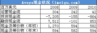2008、2009、2010財(cái)年Avaya公司運(yùn)營現(xiàn)金流分別為3.04億美元、2.42億美元、4200萬美元,2010財(cái)年運(yùn)營現(xiàn)金流急劇減少因并購北電的企業(yè)通信部門(NES)影像所致,截至2010財(cái)年(即2010年9月30日)Avaya公司現(xiàn)金及等價(jià)物為5.94億美元。