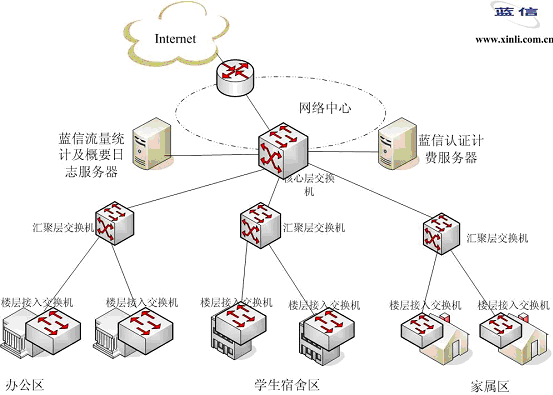 在網(wǎng)絡(luò)中心機(jī)房部署“藍(lán)信認(rèn)證計(jì)費(fèi)系統(tǒng)”,藍(lán)信認(rèn)證計(jì)費(fèi)系統(tǒng)除支持標(biāo)準(zhǔn)的RADIUS協(xié)議外,還支持領(lǐng)先的802.1x協(xié)議,通過(guò)與各接入層交換機(jī)的配合,實(shí)現(xiàn)了認(rèn)證管理功能。通過(guò)綁定帳號(hào)、IP、MAC地址等15元素,真正保證只有合法用戶才能通過(guò)認(rèn)證;對(duì)用戶進(jìn)行分級(jí)權(quán)限管理,可按信用度等級(jí)對(duì)用戶進(jìn)行劃分,方便了用戶的管理。此外,在網(wǎng)絡(luò)出口處部署藍(lán)信流量統(tǒng)計(jì)工具,通過(guò)與藍(lán)信認(rèn)證計(jì)費(fèi)系統(tǒng)的配合,實(shí)現(xiàn)對(duì)用戶按流量來(lái)計(jì)費(fèi),可以把用戶訪問(wèn)流量按校內(nèi)校外、國(guó)內(nèi)國(guó)際來(lái)區(qū)別對(duì)待,并設(shè)置不同的費(fèi)率。同時(shí),還部署了藍(lán)信概要日志系統(tǒng),有效記錄了用戶的上網(wǎng)信息,并提供人性化的web客戶端,方便管理者進(jìn)行事后查詢,有效的控制了網(wǎng)絡(luò)的安全性。