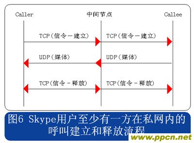 從上述流程圖可見(jiàn),Skype的呼叫信令都采用TCP封裝,而媒體流則使用UDP封裝,當(dāng)有任何一方用戶位于限制UDP包的防火墻內(nèi)時(shí),媒體流就會(huì)采用TCP封裝。另外當(dāng)Skype用戶至少有一方位于私網(wǎng)內(nèi)時(shí),所有的信令和媒體消息都經(jīng)過(guò)一個(gè)或多個(gè)中間節(jié)點(diǎn)轉(zhuǎn)發(fā)。此時(shí)無(wú)需擔(dān)心用戶通話的媒體流因?yàn)榻?jīng)過(guò)中間節(jié)點(diǎn)轉(zhuǎn)發(fā)而被竊聽(tīng),因?yàn)镾kype采用了對(duì)消息進(jìn)行端到端加密的機(jī)制。
