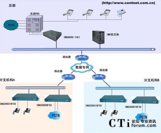 方案組網(wǎng)說明:通過呼叫中心服務(wù)器E1接口聯(lián)系數(shù)字中繼CNG8000-1*E1, 遠(yuǎn)程座席接CNG3000FXS ,遠(yuǎn)程PSTN接CNG3000FXO設(shè)備,上述設(shè)備統(tǒng)一注冊到CMC軟交換上。