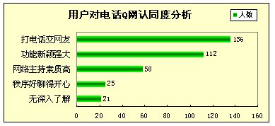 在參與調(diào)查用戶中有266位用過其他電話Q吧產(chǎn)品,但其中82%的用戶認(rèn)為電話Q網(wǎng)更吸引人。由此可見,電話Q網(wǎng)“電話直通互聯(lián)網(wǎng),交友就要交網(wǎng)友”的強大功能和定位,有效促進(jìn)了用戶對于Q網(wǎng)系統(tǒng)完善、功能先進(jìn)的認(rèn)知,并使電話Q網(wǎng)和其它Q吧相比建立起顯著的市場區(qū)隔和優(yōu)勢。