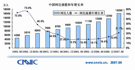 1、上網(wǎng)人數(shù)持續(xù)發(fā)展,截止到2007年6月底,已達(dá)1.62億。手機上網(wǎng)人數(shù)已達(dá)4430萬,而上一年這個數(shù)字為1700多萬。