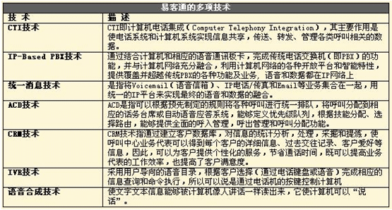易客通將全套的語(yǔ)音、數(shù)據(jù)、互聯(lián)網(wǎng)服務(wù)和豐富的業(yè)務(wù)應(yīng)用整合到單個(gè)系統(tǒng)中(All-In-One),融合語(yǔ)音和數(shù)據(jù),以模塊化的形式提供各種功能(CRM、IVR、多媒體功能、錄音、報(bào)表、管理工具、客戶化產(chǎn)品定制開(kāi)發(fā)工具、自動(dòng)外撥系統(tǒng)等),滿足不同用戶的需求,系統(tǒng)開(kāi)放、可靠、易于擴(kuò)展和升級(jí),容易獲得和使用,一切都非常簡(jiǎn)單,可以從容應(yīng)對(duì)e時(shí)代企業(yè)通信系統(tǒng)所面臨的諸多復(fù)雜挑戰(zhàn)。