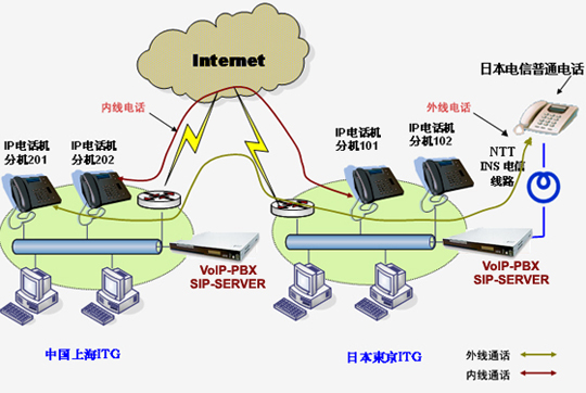 上海愛吉研發(fā)的VoIP-PBX軟交換系統(tǒng)已經(jīng)成功地在上海愛吉和日本愛吉以及日本的客戶間實施。目前應用上海愛吉生產(chǎn)的VoIP-PBX產(chǎn)品,可以實現(xiàn)從上海愛吉的任意IP電話機撥打內部分機號,例如:101,成功實現(xiàn)從Internet互聯(lián)網(wǎng)接通位于日本東京的日本ITG或日本OKI公司的IP電話機,而不產(chǎn)生任何的電信費用。另外,目前通過日本的NTTINS 交換機,還實現(xiàn)了從上海愛吉的IP電話機可以撥打日本方面的任意普通電話,即日本電信范圍內的任意普通電話,而僅僅產(chǎn)生從日本ITG到日本其它地方的短途或國內長途費用,而沒有上海到日本的國際長途費用。具體的網(wǎng)絡應用圖如下所示: