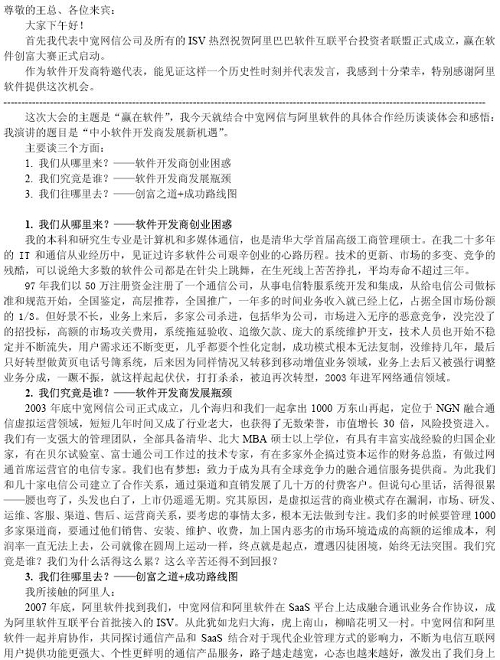 余輝先生在大會上表示,對于整個互聯(lián)網(wǎng)、軟件產(chǎn)業(yè)鏈條來說,在線軟件(SaaS)不但是最熱門的話題,更是順應(yīng)市場需要的新技術(shù)趨勢,中寬網(wǎng)信將和阿里軟件一起,在打造全球“軟件沃爾瑪超市”的過程中發(fā)揮自己的技術(shù)應(yīng)用研發(fā)強項,為全國2億互聯(lián)網(wǎng)網(wǎng)民提供更豐富便利、更低成本的軟件服務(wù)。余輝先生還和與會嘉賓分享了中寬網(wǎng)信和阿里軟件合作過程中的體會和感悟。