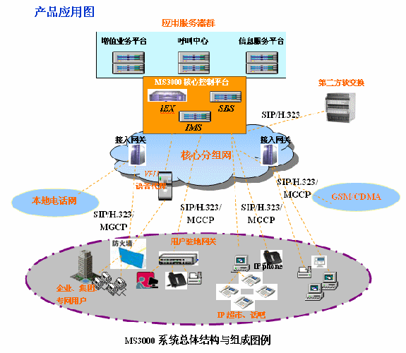| MS3000核心平臺組成 iEX--IP電話交換機 IMS--綜合管理系統(tǒng) SBS--綜合計費系統(tǒng) VPU--語音代理單元 iTalk--軟電話終端 |