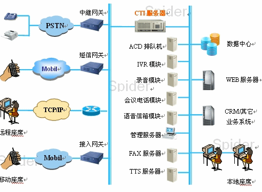 隨著呼叫中心相關(guān)技術(shù)的發(fā)展,呼叫中心的功能日益豐富,其組成結(jié)構(gòu)也日益復(fù)雜。一個(gè)完整的呼叫中心可以認(rèn)為由基本部分和擴(kuò)展部分兩部分組成。呼叫中心的基本組成部分為:自動(dòng)呼叫分配模塊(ACD)、IVR交互式語(yǔ)音應(yīng)答系統(tǒng)、CTI服務(wù)器、錄音、人工座席、班長(zhǎng)席、后臺(tái)管理系統(tǒng)等;擴(kuò)展模塊包括FAX服務(wù)器、web服務(wù)器、email服務(wù)器及語(yǔ)音信箱、會(huì)議電話等功能。