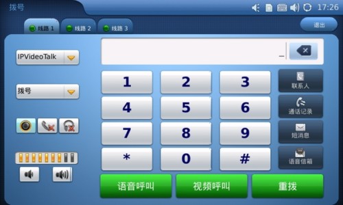 7寸大屏搭配寬大的數(shù)字虛擬鍵盤,讓你的撥號準(zhǔn)確無誤。同時界面的所顯示的通話功能諸如查找聯(lián)系人、查找通話記錄、發(fā)送短消息或者快速進(jìn)入語音信箱等功能也清晰明了。可以發(fā)現(xiàn)的是,用戶在輸完號碼之后可自主選擇采用語音呼叫還是視頻呼叫。另外,同潮流網(wǎng)絡(luò)之前的一款視頻電話GXV3140一樣的是,GXV3175也在出廠自帶了一個IPVideoTalk賬號。該賬號是出廠時就已配置好的,每一臺電話配備一個號碼并顯示在桌面上。也就是說,用戶在拿到GXV3175并聯(lián)網(wǎng)之后即可使用該賬號撥打免費(fèi)的視頻電話了。這可是很多廠商所沒有的特殊功能。下面我們就使用隨機(jī)附送的IPVideoTalk賬號來撥打視頻電話。