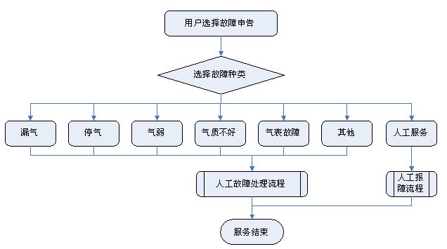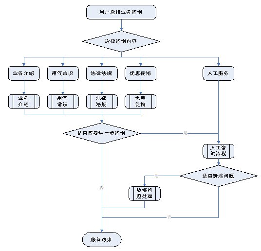 1)業(yè)務(wù)咨詢(xún):用戶(hù)通過(guò)人工、自動(dòng)語(yǔ)音等方式咨詢(xún)有關(guān)政策法規(guī)、資費(fèi)標(biāo)準(zhǔn)、用氣常識(shí)、報(bào)裝方法等,系統(tǒng)以語(yǔ)音、傳真、Email、短消息等方式回復(fù)客戶(hù)。