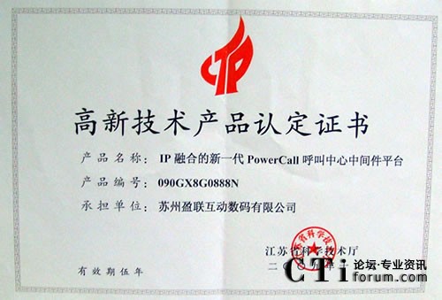 CTI論壇(ctiforum)4月20日消息(記者 楊毅):近日,蘇州盈聯(lián)互動數(shù)碼有限公司榮獲江蘇省科學技術(shù)廳頒發(fā)的高新技術(shù)產(chǎn)品認定證書,這標志著盈聯(lián)作為一家專業(yè)的呼叫中心解決方案提供商,其產(chǎn)品的先進性和高品質(zhì)已獲得了中國技術(shù)部門的官方認可。