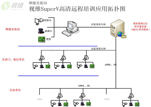 順德安監(jiān)局各部門(mén)及下屬單位使用安監(jiān)系統(tǒng)專(zhuān)網(wǎng)進(jìn)行連接,而重點(diǎn)培育企業(yè)網(wǎng)絡(luò)情況復(fù)雜,涉及ADSL以及3G無(wú)線(xiàn)網(wǎng)絡(luò)等多種情況,視維根據(jù)順德安監(jiān)局、局下屬單位及重點(diǎn)培育企業(yè)的分布情況,將服務(wù)器架設(shè)在順德安監(jiān)局總部,并在總部搭建會(huì)議室和培訓(xùn)中心,其他各部門(mén)、下屬單位和重點(diǎn)培育企業(yè)為分會(huì)場(chǎng)。