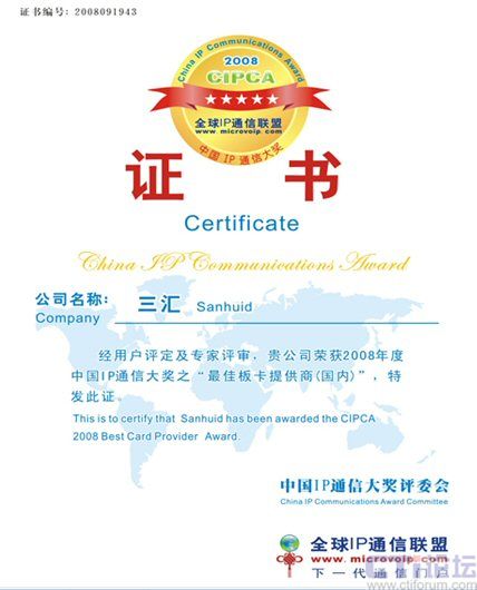 9月19日,在上海盛大舉行的CIPCC中國IP通信大會(huì)上,杭州三匯摘取了CIPCA 2008年國內(nèi)最佳語音板卡提供商大獎(jiǎng),體現(xiàn)了杭州三匯在國內(nèi)語音卡領(lǐng)域的絕對(duì)領(lǐng)導(dǎo)和優(yōu)勢(shì)地位。