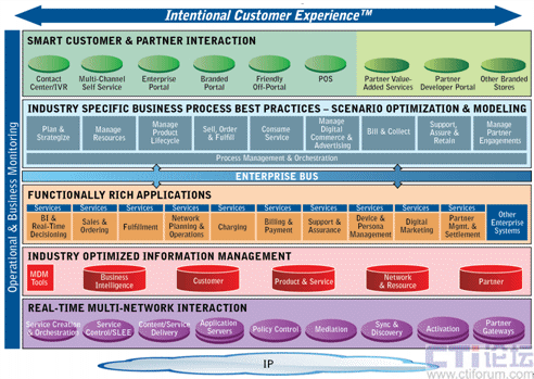 其次,CES改變了現(xiàn)有的業(yè)務(wù)應(yīng)用層將功能和流程融合在一起的模式,對(duì)流程和功能進(jìn)行了分離。實(shí)際上,應(yīng)用功能和流程結(jié)合得越緊密,系統(tǒng)的適應(yīng)性就會(huì)越差,對(duì)新業(yè)務(wù)和新產(chǎn)品的響應(yīng)時(shí)間就越長(zhǎng),CES將業(yè)務(wù)應(yīng)用層分為流程層和應(yīng)用功能層,流程和功能的分離極大的提高了系統(tǒng)靈活性,降低了系統(tǒng)集成的復(fù)雜程度和成本開(kāi)銷,滿足了新業(yè)務(wù)和新產(chǎn)品快速上市的要求。在流程層,運(yùn)營(yíng)商不僅可以選擇采用Amdocs在25年服務(wù)經(jīng)驗(yàn)的基礎(chǔ)上總結(jié)的業(yè)界最佳實(shí)踐的業(yè)務(wù)流程,也可以選擇采用企業(yè)現(xiàn)有的業(yè)務(wù)流程;在應(yīng)用功能層,Amdocs全系列軟件產(chǎn)品將更加模塊化,運(yùn)營(yíng)商可以選擇Amdocs全系列軟件產(chǎn)品,也可以選擇其中的個(gè)別或部分產(chǎn)品,這種高度模塊化的產(chǎn)品將以更快的速度集成到運(yùn)營(yíng)商已有的IT框架中。