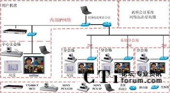 本次系統(tǒng)根據(jù)各會(huì)場(chǎng)不同規(guī)模的應(yīng)用,共采用了1臺(tái)Sony PCS-G50P、29臺(tái)Sony PCS-1P,每臺(tái)終端還配置了用于PC圖文傳輸?shù)碾p流盒,共30個(gè)。多點(diǎn)控制單元(MCU)采用超然的VmediaX VX4000-T(32個(gè)點(diǎn))。系統(tǒng)拓?fù)鋱D如下: