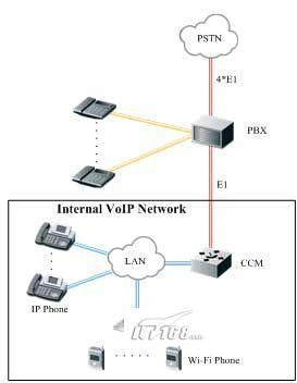 酒店申請(qǐng)了4條到CNC的E1線路,用于語(yǔ)音呼叫業(yè)務(wù),同時(shí)內(nèi)部還建設(shè)有覆蓋整個(gè)酒店的VoIP網(wǎng)絡(luò),通過(guò)CCM系統(tǒng)進(jìn)行集中管理,CCM系統(tǒng)與PBX之間通過(guò)E1線進(jìn)行連接。