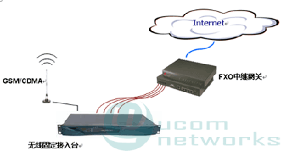 本方案采用FXO中繼語音網(wǎng)關(guān)接入互聯(lián)網(wǎng),由當(dāng)?shù)仄胀M電話線路落地對接網(wǎng)關(guān)FXO口,采用電話卡綁定網(wǎng)關(guān)預(yù)付費計費實現(xiàn)運營。落地線路接入可以使用本地固定PSTN線路,也可以轉(zhuǎn)制無線電話,采用固定臺接入,2種拓?fù)鋱D如下所示。