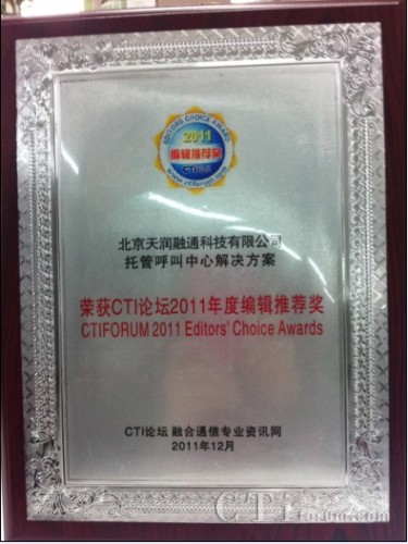 CTI論壇(ctiforum)1月13日消息(記者 潘婷婷): 近日, CTI論壇舉辦的“CTI論壇2011年度編輯推薦獎(jiǎng)”評(píng)選活動(dòng)落下帷幕,天潤融通的解決方案成功斬獲了CTI論壇編輯推薦獎(jiǎng)。