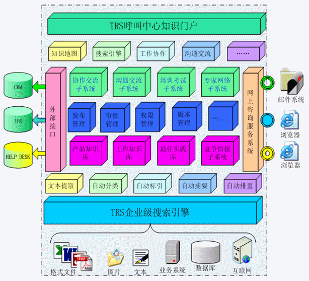 TRS Call Center 知識(shí)管理系統(tǒng)構(gòu)建在TRS企業(yè)級(jí)搜索引擎之上,融合了TRS文本挖掘技術(shù)和內(nèi)容管理技術(shù),全面包括知識(shí)庫(kù)、競(jìng)爭(zhēng)情報(bào)、專家網(wǎng)絡(luò)、培訓(xùn)考試、溝通交流和協(xié)作交流六大子系統(tǒng),以及發(fā)布管理、審批管理、權(quán)限管理、版本控制等系統(tǒng)管理模塊;并集成面向用戶的網(wǎng)上咨詢服務(wù)系統(tǒng),提供面向客戶管理信息系統(tǒng)(CRM)、自動(dòng)語(yǔ)音應(yīng)答系統(tǒng)(IVR)、Help