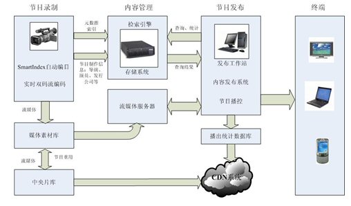 農(nóng)村黨員干部現(xiàn)代遠(yuǎn)程教育系統(tǒng)是涉及多個(gè)層面的系統(tǒng)工程,基礎(chǔ)設(shè)施建設(shè)內(nèi)容主要包括:節(jié)目制作平臺(tái)、中心資源庫、節(jié)目發(fā)布平臺(tái)、信息管理系統(tǒng)、接收終端等部分。該方案基于全球最成熟的寶麗星通軟件(北京)有限公司研發(fā)的寶麗通流媒體支撐平臺(tái),具備在現(xiàn)有網(wǎng)絡(luò)基礎(chǔ)架構(gòu)上開展豐富多彩的面向農(nóng)村黨員和農(nóng)民用戶的視聽類的綜合信息服務(wù)。系統(tǒng)結(jié)構(gòu)如下圖所示。