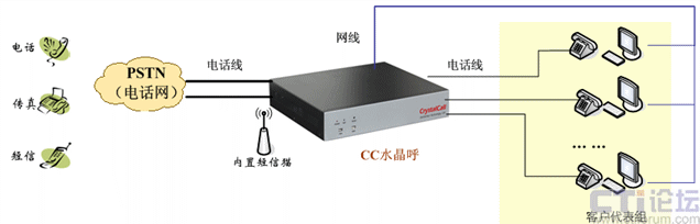 CC水晶呼單獨組網(wǎng),對外接運營商的電話線,對內(nèi)接分機線,組網(wǎng)說明如下: