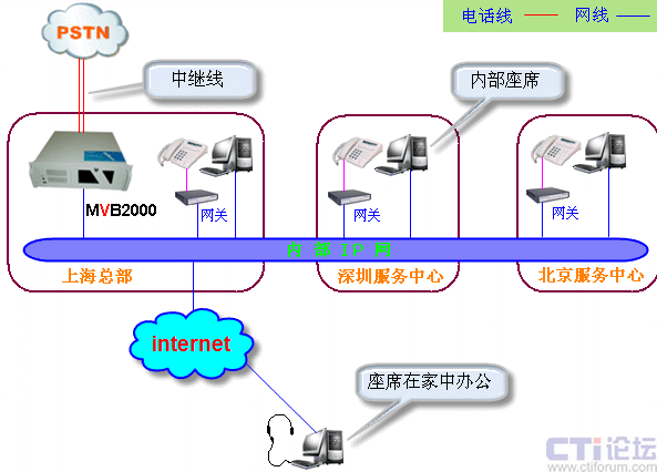在技術(shù)上,MVB2000 的語音業(yè)務(wù)通過電信運(yùn)營(yíng)商的模擬或者數(shù)字中繼線路接入,數(shù)據(jù)業(yè)務(wù)都通過局域網(wǎng)或者互聯(lián)網(wǎng)使用TCP/IP協(xié)議傳送,解決了呼叫中心中大量數(shù)據(jù)傳送的需求,請(qǐng)看下面的網(wǎng)絡(luò)組織結(jié)構(gòu)圖: