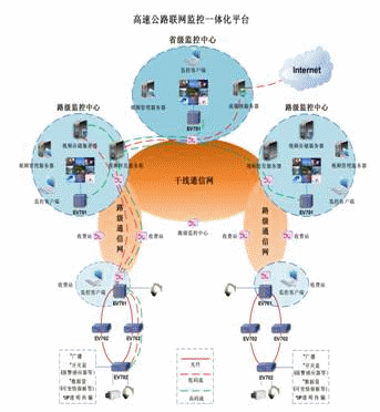 該系統(tǒng)集數(shù)字視頻傳輸、視頻管理、視頻存儲以及外網(wǎng)發(fā)布等功能為一體。 EV701中心設備有4個業(yè)務槽,可任意插拔編解碼卡,最多支持8路視音頻數(shù)據(jù)。采用H.264編碼標準的EV702外場綜合接入設備,將原來外場分散的攝像頭、快球、云臺、可變情報板、報警感應器等設備融為一體,同時也支持MPEG編碼標準的視音頻接入?梢酝瑫r編碼2路以上的視音頻信號,支持雙流傳輸,D1數(shù)據(jù)用于實時觀看,CIF數(shù)據(jù)用于存儲和Web網(wǎng)業(yè)務(包括對外發(fā)布實時圖像和管理人員異地監(jiān)控)。具備IP開關斷功能,減輕了通信網(wǎng)絡的壓力。 路級中心、區(qū)域中心、省級中心分布式多級監(jiān)控,由省中心統(tǒng)一設定權限,進行集中管理。