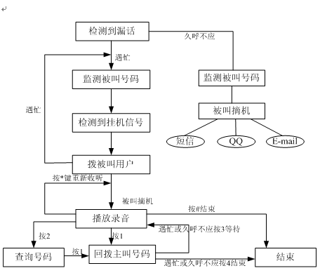 當(dāng)用戶A呼叫用戶B久呼不應(yīng)的時(shí)候,系統(tǒng)則檢測(cè)被叫的摘機(jī)信號(hào),監(jiān)測(cè)到摘機(jī)信號(hào)后系統(tǒng)會(huì)以短信、QQ、E-mail等形式通知主叫用戶。
