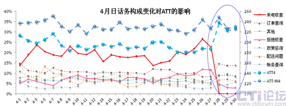 從圖12也可以明顯的看出:ATT“月末彈起”現象的原因同樣是“簡單話務比例的下降必然帶來整體ATT的上升;復雜話務比例的上升也必然帶來整體ATT的上升”;具體因為Avon調整了業(yè)務政策,從3月開始,每月27日18:00后至月末NCC不受理來電核查,因此該類話務從27日的25%左右突降為0;拒絕核查的量比也有-7%的大幅下降(從12%下降到5%以下);而復雜業(yè)務如政策咨詢、配送問題則有+6%的較大幅度上升(約從10%上升到16%)。