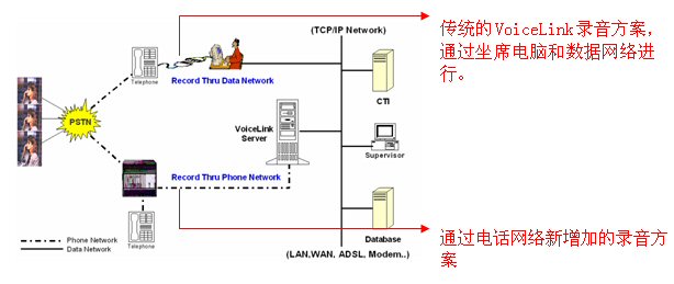 在Voicelink 電話網(wǎng)絡(luò)錄音方案下,語音可以通過每條的電話線獲得并能連接到Voicelink服務(wù)器上。語音將在Voicelink服務(wù)器里被處理,該服務(wù)器內(nèi)裝有語音卡。通過電話“摘機”和“掛機”的動作來啟動錄音和結(jié)束錄音。在TCP/IP的網(wǎng)絡(luò)下,主管可以調(diào)聽錄音并通過登陸到服務(wù)器上進行用戶管理。