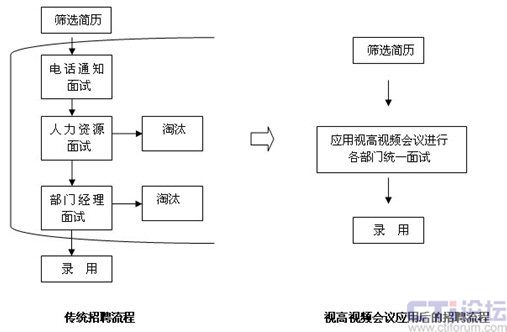 從上圖不難看出,通過應用視高(Seegle)視頻會議系統(tǒng)進行招聘,能大大縮短流程和周期,免除了求職者一次次的來回奔波,方便異地進行面試。企業(yè)不僅可以在當?shù)卣衅,更可以將招聘延伸到全國,甚至世界?br />