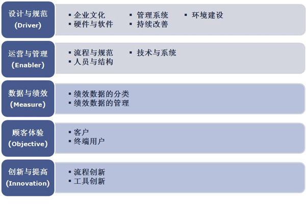 呼叫中心能力成熟度認(rèn)證涉及設(shè)計(jì)與規(guī)范、運(yùn)營與管理、數(shù)據(jù)與績效、顧客體驗(yàn)、創(chuàng)新與提高5大類,14項(xiàng)評(píng)審指標(biāo)以及若干個(gè)值得關(guān)注的管理項(xiàng)目。是一套完整的“客戶為中心”的績效管理工具。