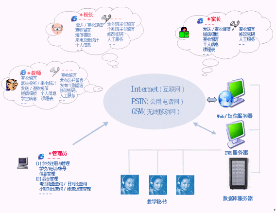 | 班主任留言(電話) | 通過電話直接給全體班主任或個別班主任留言,發(fā)布學校動態(tài),班主任通知等。 |