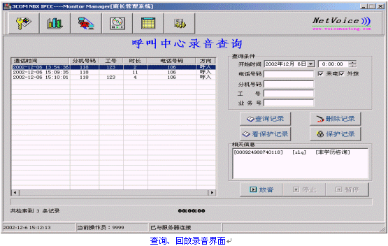 NetVoice作為3Com NBX網(wǎng)絡(luò)電話產(chǎn)品中國(guó)區(qū)總分銷,在積累大量3Com IPCC開(kāi)發(fā)應(yīng)用經(jīng)驗(yàn)的基礎(chǔ)上,通過(guò)對(duì)3Com NBX產(chǎn)品技術(shù)特性的詳盡分析,并結(jié)合其它錄音產(chǎn)品的成功開(kāi)發(fā)經(jīng)驗(yàn),成功的在3Com