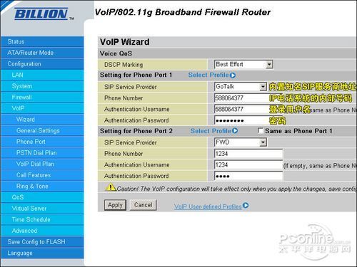 把申請得到的相關數據填入BiPAC 6404VGP中,在路由器后面接上電話就可以享受完全免費或超低價格的電話服務了。同一個SIP服務器下面的用戶互相撥打電話、收發(fā)傳真是免費的。