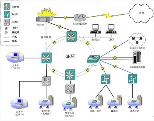 此城域網(wǎng)結(jié)構(gòu)清晰,由核心層的三層交換機(jī)只負(fù)責(zé)數(shù)據(jù)的快速轉(zhuǎn)發(fā),對(duì)業(yè)務(wù)匯聚和用戶的認(rèn)證控制任務(wù)全部由接入服務(wù)器R4000來完成。要求接入服務(wù)器支持多種認(rèn)證手段、加強(qiáng)對(duì)各類用戶實(shí)現(xiàn)不同級(jí)別的控制、為用戶的訪問提供安全保障措施、結(jié)合Radius系統(tǒng)提供多種計(jì)費(fèi)功能。