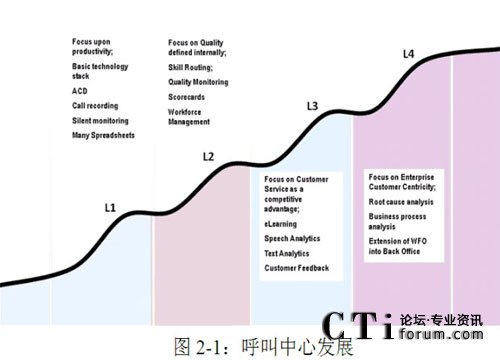 在現(xiàn)實(shí)中,還存在零程度的呼叫中心,這一點(diǎn)并沒有體現(xiàn)在呼叫中心發(fā)展路線圖上。零程度的呼叫中心就是那些在運(yùn)營過程中并沒有很好地認(rèn)識(shí)到自己角色以及對(duì)自己未來的發(fā)展毫無計(jì)劃的呼叫中心。