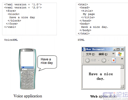 就象程序員可以使用HTML/XML語言開發(fā)WEB應(yīng)用程序,從而把文字和圖片等信息以網(wǎng)頁的方式提供給用戶類似,程序員可以使用VoiceXML語言開發(fā)基于語音的應(yīng)用程序,從而把用戶需要的信息以語言的形式提供給用戶。 用戶可以通過VoIP終端或者傳統(tǒng)電話來訪問這類應(yīng)用程序從而得到想要的信息(如天氣,股市,定位等)。和用戶訪問WEB頁面時(shí)需要通過鍵盤輸入想要查詢的內(nèi)容不同,用戶訪問基于 VoiceXML的語言應(yīng)用時(shí)可以通過“說話”來獲取想要的信息。執(zhí)行VoiceXML語言的VoiceXML服務(wù)器負(fù)責(zé)把用戶的語音轉(zhuǎn)換成文字(自動(dòng)語音識(shí)別)進(jìn)行搜索并把搜索到的結(jié)果以語音的方式“讀”給用戶(語音合成輸出)。下圖(圖一)顯示了基于VoiceXML的語音應(yīng)用和基于HTML的WEB應(yīng)用的相似和不同。