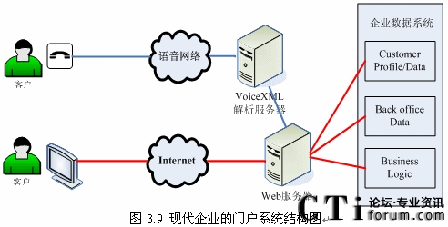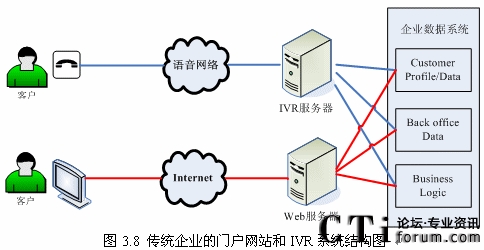 隨著Internet和Web技術(shù)的迅速發(fā)展,越來(lái)的企業(yè)開(kāi)始建立自己的門(mén)戶(hù)網(wǎng)站,同時(shí)又擁有自己的IVR系統(tǒng)(如圖3.8所示),但是兩套系統(tǒng)完全獨(dú)立,語(yǔ)音系統(tǒng)和數(shù)據(jù)系統(tǒng)沒(méi)有任何交互或者只有很少的交互。而建立IVR系統(tǒng)的目標(biāo)就是給客戶(hù)更好的體驗(yàn),使客戶(hù)能方便的通過(guò)電話完成更多以前需要登陸企業(yè)門(mén)戶(hù)網(wǎng)站,或者親自去企業(yè)或其網(wǎng)點(diǎn)去辦理的業(yè)務(wù),這就需要IVR系統(tǒng)能跟后臺(tái)數(shù)據(jù)系統(tǒng)有更多更好的交互。“語(yǔ)音門(mén)戶(hù)”的概念出現(xiàn)也愈發(fā)的證明這一點(diǎn)。