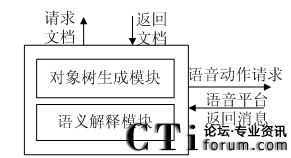 作為VoiceXML語(yǔ)言的解釋工具,文檔解析是VoiceXML解析器主要任務(wù),也是執(zhí)行引擎的重要組成部分,文檔解析的內(nèi)容決定了執(zhí)行平臺(tái)的下一步操作,也是整個(gè)系統(tǒng)運(yùn)行的核心。因?yàn)閂oiceXML文檔首先是一個(gè)XML文檔,所以主要包含對(duì)象樹(shù)生成模塊和語(yǔ)義解釋模塊兩個(gè)部分。其中對(duì)象樹(shù)生成模塊是對(duì)VoiceXML文檔進(jìn)行XML方式的解析,解釋模塊使用FIA算法對(duì)生成的對(duì)象進(jìn)行解析。圖3.13描述了VoiceXML解析器文檔解析的模型。