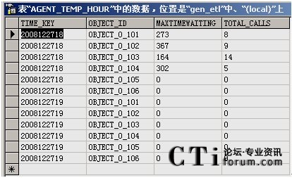 從報表數(shù)據(jù)庫的相應(yīng)表中,可以看出報表需要統(tǒng)計的數(shù)據(jù)信息都以表單形式列出來。圖中的Time Key表示收集數(shù)據(jù)的具體時刻,object_id表示目標(biāo)對象在配置數(shù)據(jù)庫中存儲的ID號。MaxTimeWaiting和Total_Calls屬性對應(yīng)的是根據(jù)模板項(xiàng)要求統(tǒng)計的數(shù)據(jù),分別為最大等待時間和內(nèi)線呼叫總量。下面利用報表展現(xiàn)工具可以直接將該數(shù)據(jù)展示出來,生成需要的報表。