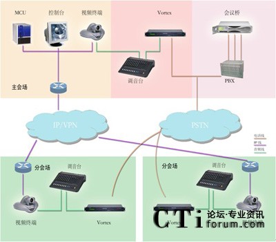 系統(tǒng)基于PSTN電話網絡, 在視頻會議系統(tǒng)中心會場配備一套POLYCOM VORTEX EF2241與會場調音臺聯結,并根據會場數量配備一套相應方數的音頻會議橋,各分會場分別配備一套POLYCOM VORTEX EF2211與會場調音臺聯結,如用戶無線路條件,也可使用當地運營商的電話會議平臺。