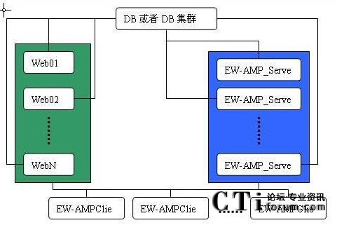 EW-AMP中間件在應(yīng)用中,可以配置多臺(tái)EW-AMP Server服務(wù)器由EW-AMP應(yīng)用集群技術(shù)組成EW-AMP Server集群,也可以配置多臺(tái)客戶的Web應(yīng)用(如CRM,MIS等)由EW-AMP